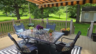 Stay at The Brixton, a cozy retreat featuring a spacious living room with leather recliners, a split king adjustable bed, two full bathrooms, and a large deck with glowing patio lights — the perfect spot for gathering, sharing meals, or enjoying evening conversations.